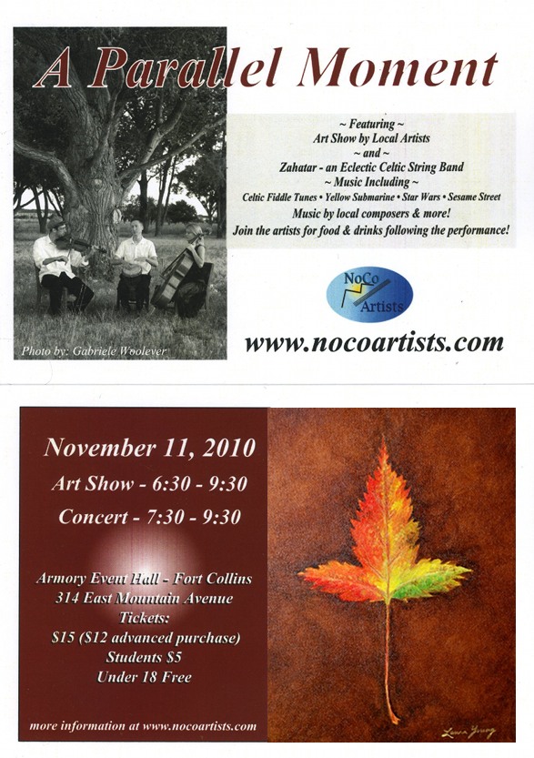 Next week is a fantastic opportunity to experience both fine art AND fine music right here in Fort Collins: "A Parallel Moment" is a NoCoArtists show featuring Zahatar, an eclectic Celtic string band, as well as the work of several local artists -- including yours truly. It's going to be held November 11th at the newly-restored Armory building at 314 E. Mountain Ave. (In Old Town, right next to the Melting Pot fondue restaurant) from 6:30 to 9:30pm. So if you're free this upcoming Thursday, please consider coming over! We'd love to see you there. Tickets are $12 if pre-purchased online at http://www.nocoartists.com and $15 at the door.